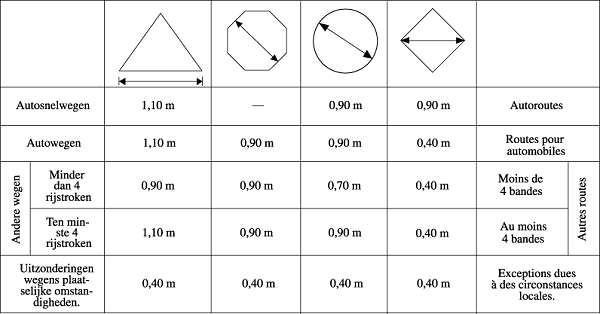 6.4.1. En dehors des agglomérations, les signaux routiers ayant les formes dessinées ci-dessous, ont les dimensions minimales suivantes :