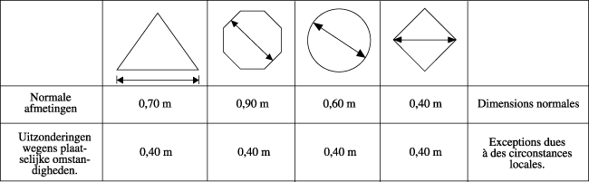 6.4.2. Dans les agglomérations, les signaux routiers ayant les formes dessinées ci-dessous ont les dimensions minimales suivantes :