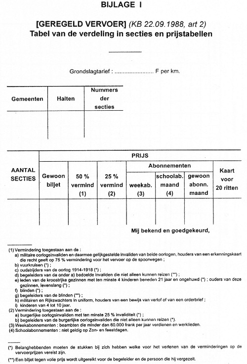 Les cartes d'abonnement doivent être munies d'une souche et brochées en bloc de cent pièces au moins. Elles doivent être imprimées en noir et porter l'indication du nom du transporteur, du nom de l'imprimeur, du prix de la carte, ainsi qu'un cachet imprimé en rouge, portant au centre le lion belge et, en exergue, les mots : "Taxe sur les transports _ Taxe op het vervoer". Ce cachet est apposé moitié sur la carte, moitié sur la souche.