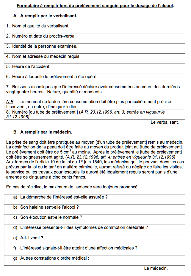 Lorsque le prélèvement est ordonné en vertu de l'article 4bis de la loi du 1er août 1899, l'autorité requérante et le médecin requis remplissent un formulaire dont le modèle constitue l'annexe 1 au présent arrêté.