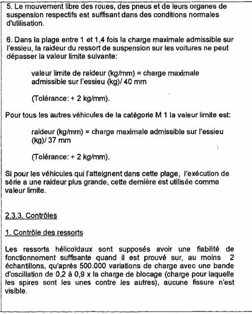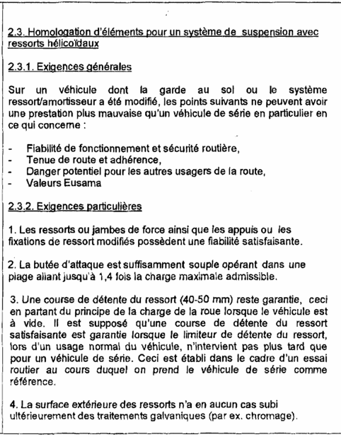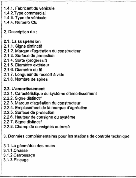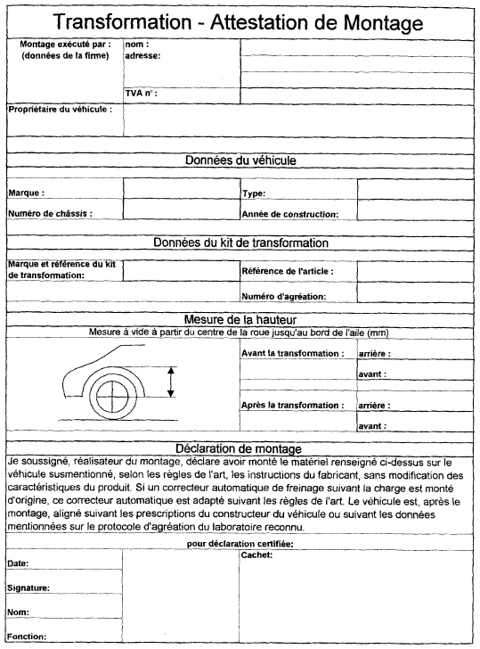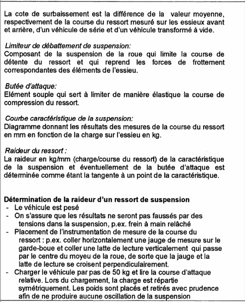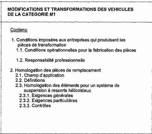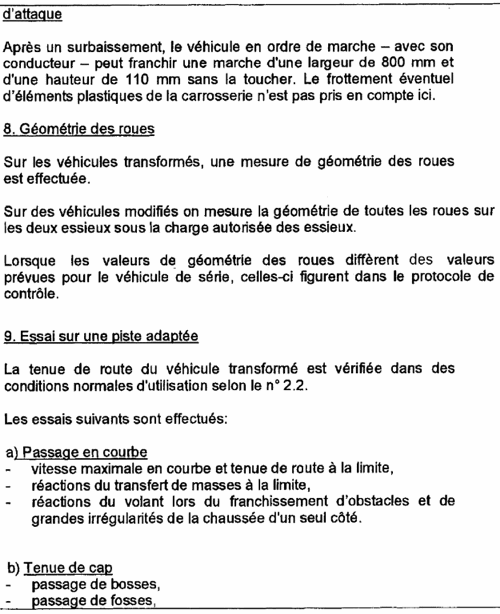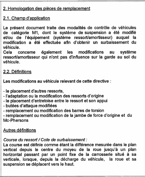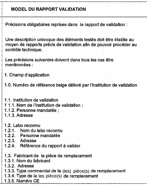 La transformation doit être exécutée conformément aux 'exigences pour l'agréation des véhicules surbaissés' des catégories M1 (annexe I). Cette conformité est attestée par un rapport d'un laboratoire reconnu. Ensuite ce rapport est validé par une institution désignée par la Direction générale de la Mobilité et de la Sécurité Routière. Le rapport validé est rédigé suivant l'annexe 2 et a entre autre pour but :