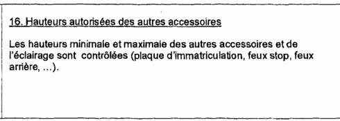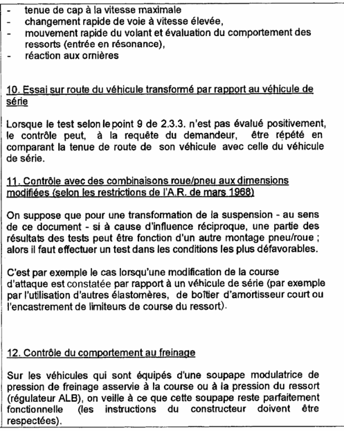 L'article 23sexies, § 1, 2°, b prévoit que : « indépendamment des règles concernant les contrôles périodiques, des contrôles non périodiques sont obligatoires avant la date de la remise en circulation, que ce soit au nom du même titulaire ou au nom d'un nouveau titulaire, de tout véhicule ayant fait l'objet d'une modification ou transformation ayant rapport au châssis, à la carrosserie ou aux équipements, avec comme conséquences une modification des caractéristiques techniques du véhicule ».