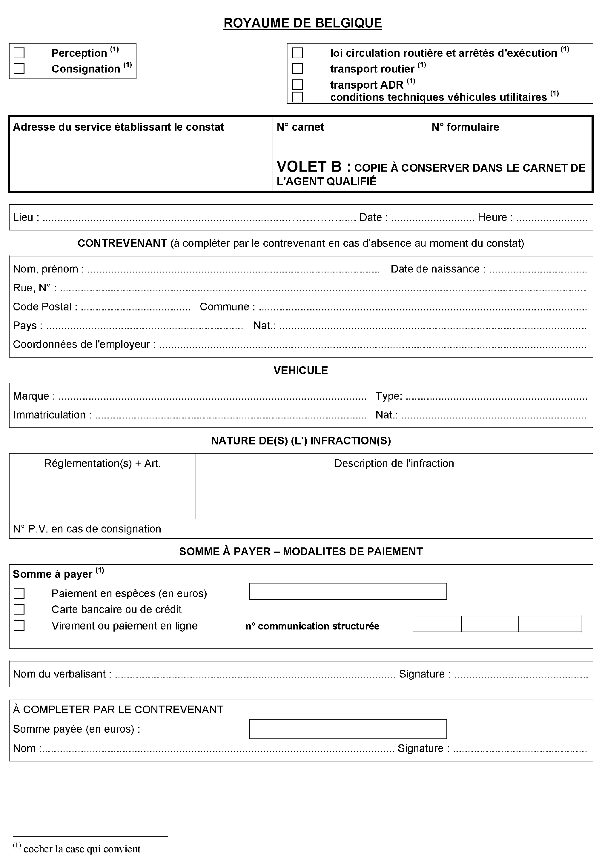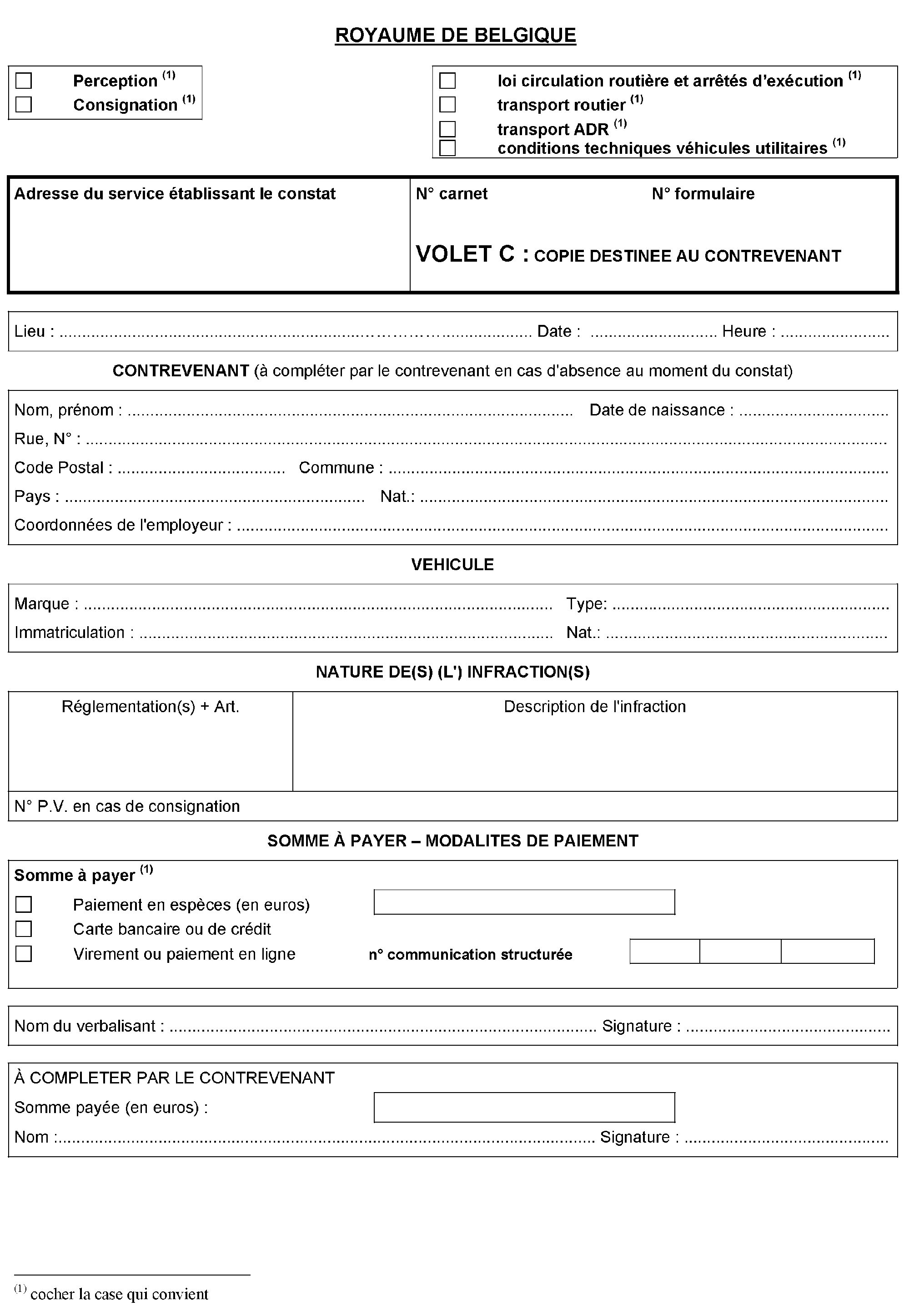 § 1er. En cas de perception, il est fait usage de formulaires numérotés réunis en carnets numérotés et conformes au modèle repris en annexe 2 de l'arrêté royal du 19 juillet 2000 relatif à la perception et à la consignation d'une somme lors de la constatation de certaines infractions en matière de transport par route. Lorsque plusieurs infractions sont constatées en même temps à charge d'un même contrevenant, celles-ci doivent être mentionnées sur le même formulaire.