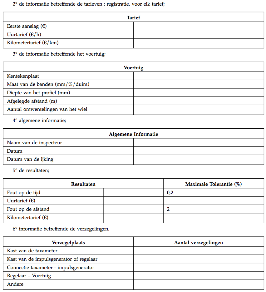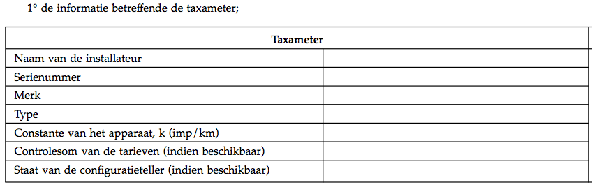 Le taximètre satisfait, après l'installation et lors de l'utilisation, aux exigences de l'annexe MI-007 de l'arrêté royal du 13 juin 2006 ou aux exigences de l'arrêté royal du 12 décembre 1960 relatif aux taximètres suivant le cas.