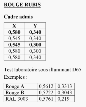 Ces dérogations correspondent à la palette de couleurs de la plaque officielle. La couleur rouge devra donc se situer dans le cadre admis, soit être le RAL 3003 avec une tolérance visuelle Delta E maximal de 4 (DELTA.E=4).