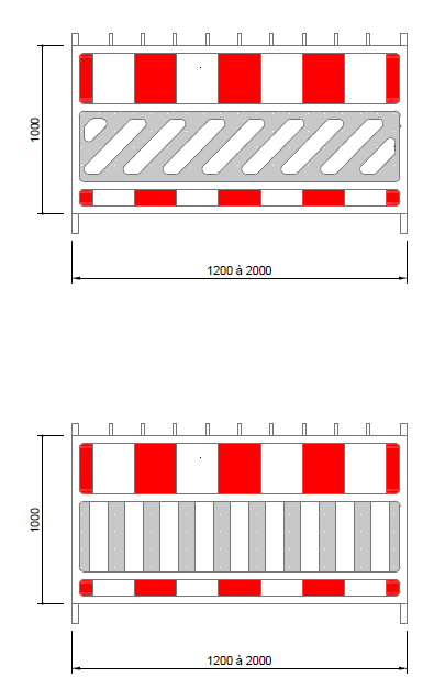 Art. 71. Les conteneurs et les obstacles placés sur la voie publique sont pourvus sur les parties avant et arrière de bandes alternées de couleur rouge et blanche de 0,10 m de largeur au minimum et inclinées à 45° par rapport à la verticale.