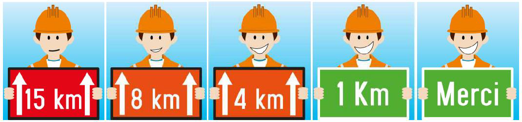 2° Pour les chantiers d’une longueur supérieure à 6 km, à environ 200 m après le début du chantier, à la moitié de la longueur du chantier, aux trois quarts de la longueur du chantier, à 1 km de la fin de chantier et à proximité de la signalisation de fin de chantier.