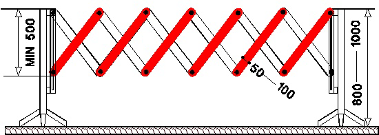 Le dispositif cadre mesure de 3000 à 3500 mm de hauteur et à une largeur de minimum 1800 mm. La largeur du cadre supportant les bandes alternées rouges et blanches est de 300 mm.